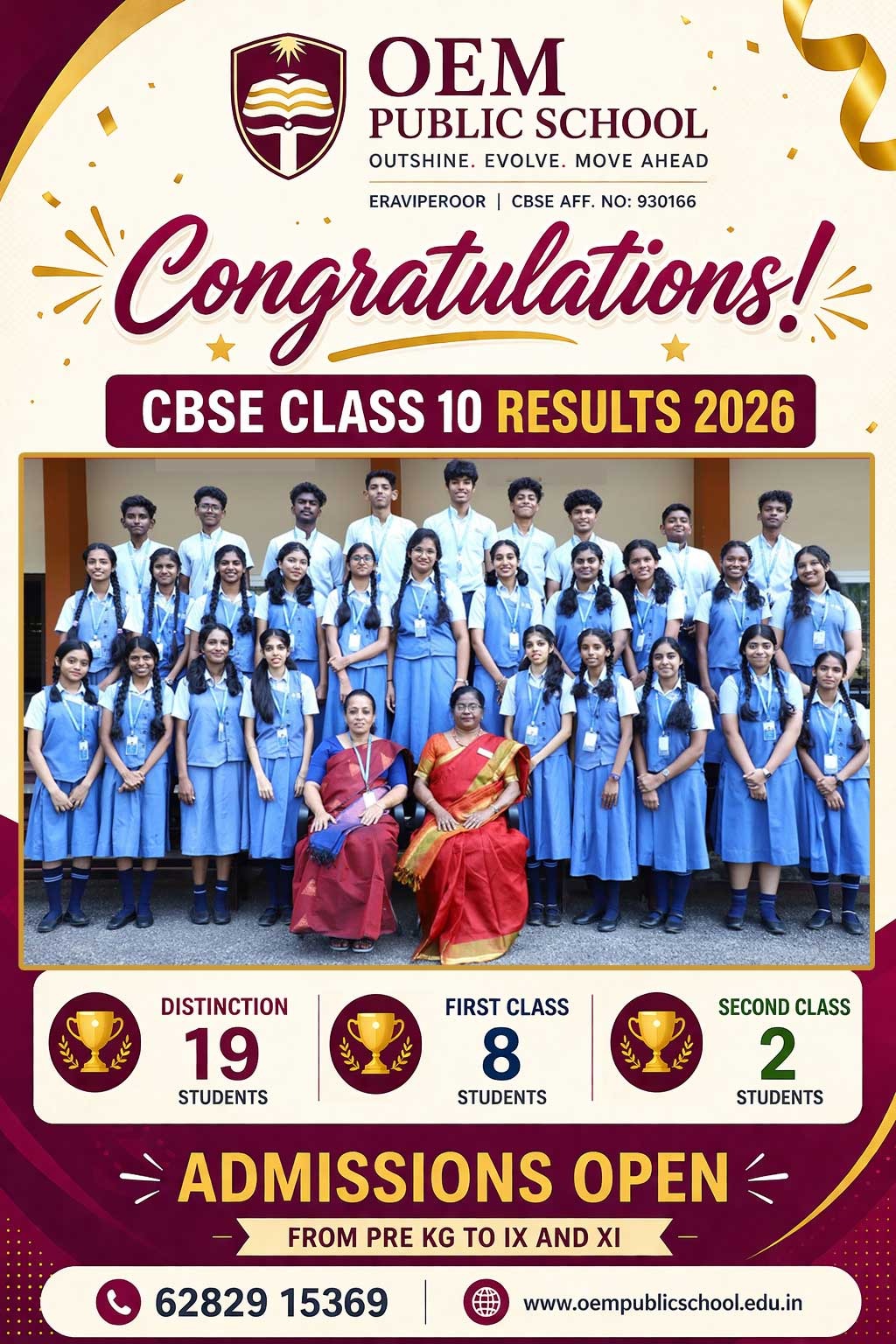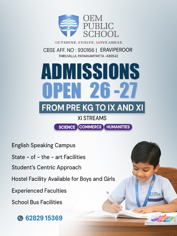 Oonianthala Eapen Memorial Public School (OEM PUBLIC SCHOOL) established in 1994 at Eraviperoor, Thiruvalla is a co educational CBSE School. It was founded by the Late O I Oommen to provide top notch education to the aspiring student community in this mosfusil. The School is situated in a sylvian setting and imbibing the culture and values of a typical Kerala Village. The School is owned and managed by a Board of Trustees. We have over 600 students on Roll from KG to Class XII. Our Foundation Section is at par with international standards. We at OEM believe that a strong base at this level shall augment the learning process and students shall feel it as an enjoyable experience. We aim to build up a competent and responsible student community whose resource in turn will add to our Nation Human Resources. Our Teaching Methodology has been fine tuned to cater students to Outshine, Evolve and Move ahead in life. We aspire to develop inquisitive mind, scientific temper, value consciousness and above all, humaneness to become leaders and winners.