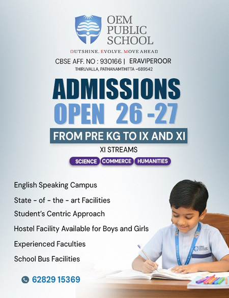 Oonianthala Eapen Memorial Public School (OEM PUBLIC SCHOOL) established in 1994 at Eraviperoor, Thiruvalla is a co educational CBSE School. It was founded by the Late O I Oommen to provide top notch education to the aspiring student community in this mosfusil. The School is situated in a sylvian setting and imbibing the culture and values of a typical Kerala Village. The School is owned and managed by a Board of Trustees. We have over 600 students on Roll from KG to Class XII. Our Foundation Section is at par with international standards. We at OEM believe that a strong base at this level shall augment the learning process and students shall feel it as an enjoyable experience. We aim to build up a competent and responsible student community whose resource in turn will add to our Nation Human Resources. Our Teaching Methodology has been fine tuned to cater students to Outshine, Evolve and Move ahead in life. We aspire to develop inquisitive mind, scientific temper, value consciousness and above all, humaneness to become leaders and winners.